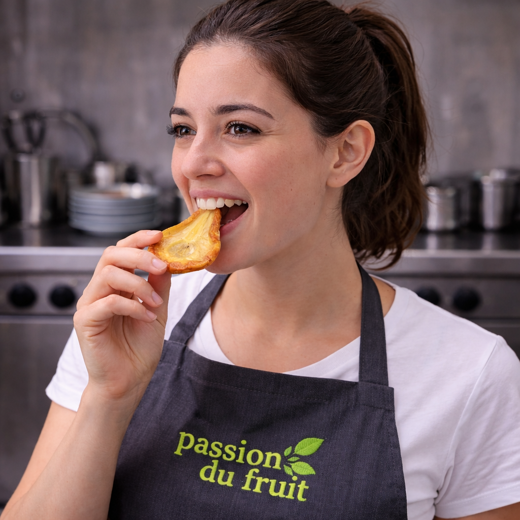 Durante la deshidratación se elimina aproximadamente el 90 % del agua presente en la fruta fresca. Esta reducción controlada intensifica los aromas sin modificar la naturaleza del producto.